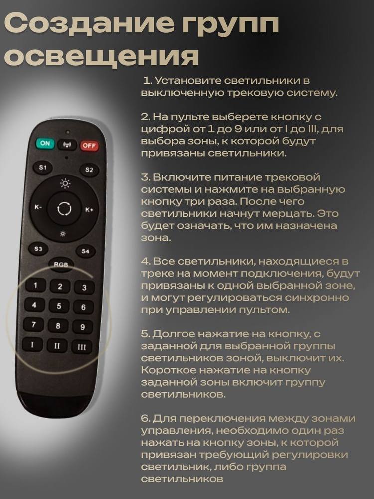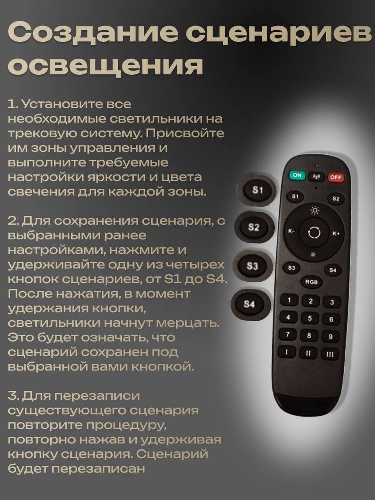 <comment>Без проблем синхронизировал светильники LINER MAGNETIC S20. Правда вышел курьез. Оказалось, что пульт от умной люстры (покупалась раньше трэков) то же без проблем управляет этими светильниками. НО. На этом пульте, типа, есть возможность настраивать сценарии и зоны управления. Получается он более функционален. Только вот как настроить сценарии и зоны - не понятно. Инструкции никакой нет. Может он и RGB лентами будет рулить, только вот что для этого нужно - пока непонятно.</comment>